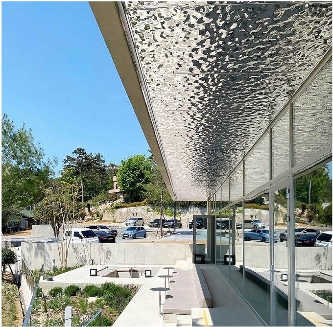 The primary allure of water ripple panels lies in their unique interaction with light. When installed in an outdoor corridor, the panels catch the shifting natural light throughout the day. Whether it’s the golden hue of a sunset or the cool glow of a cloudy afternoon, the ceiling reflects its surroundings in a distorted, artistic manner. This creates a "liquid" atmosphere, making a static walkway feel dynamic and alive. It transforms a simple transition space into a high-end gallery-like experience.